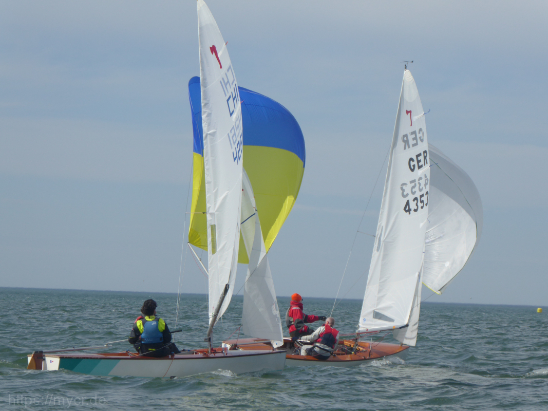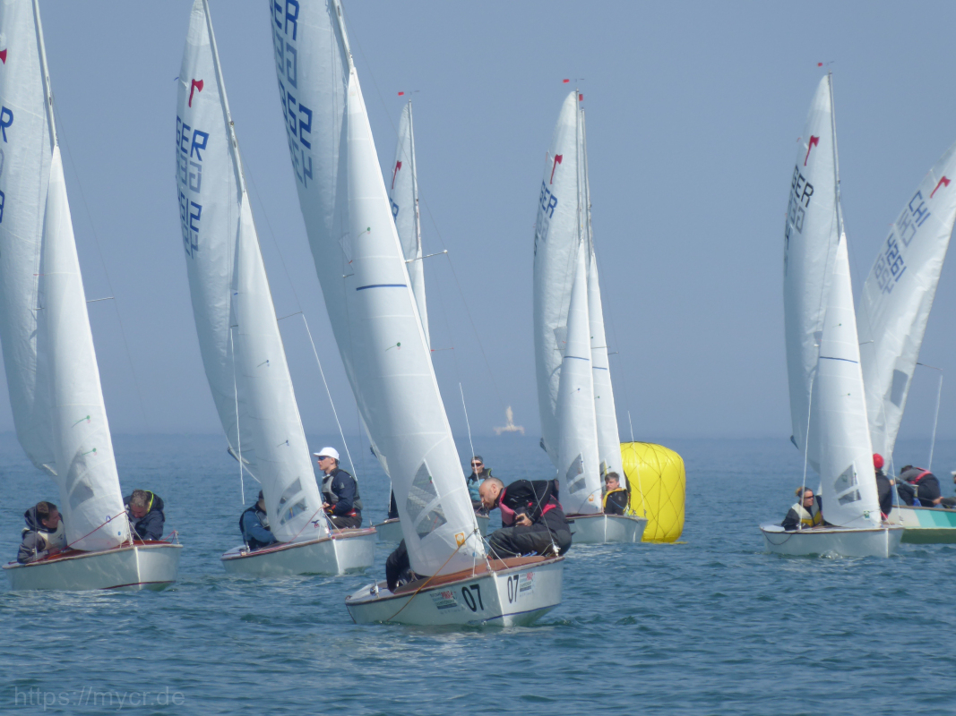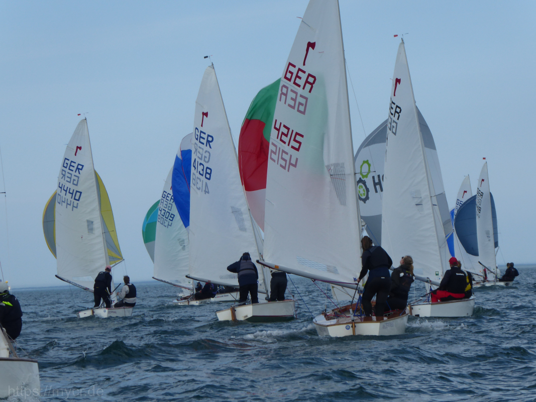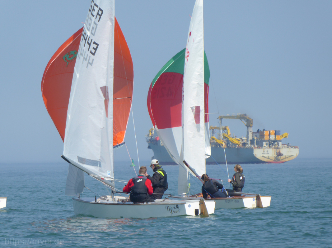 Zunächst waren es leider noch mehr Windlöcher als Windfelder aber im Laufe des Tages nahm sowohl der Wind als auch die Lufttemperaturen zu. So konnten wir mit den 19 teilnehmenden Piraten und 15 Cadets 4 Wettfahrten absolvieren. Abgestraft wurden die Segler, die sich bei anfangs stark pendelnden Winden verleiten ließen, zu weit nach außen zu fahren, belohnt wurden alle Segler von 3 Schweinswalen, die kurz vor Tonne 3 den ganzen Tag über die Rennen begleitet haben. Mit Kuchen und ohne Proteste ging der Tag mit vorsommerlichen Temperaturen für alle entspannt zu Ende.