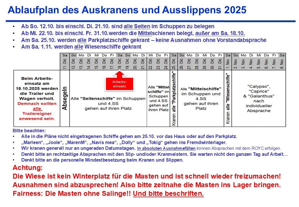 Nun steht der Herbst & Winter vor der Tür und die ersten Gedanken – wenngleich auch ungern – sind wegen der Zeitplanung nötig. Bitte setzt Euch mit den Terminen und auch den Liegeplätzen auseinander. Und Achtung: es gibt eine Reihe von Änderung.en zu 2024/2025.